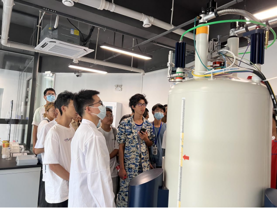 平台技术团队李雷博士、李昕翼博士、张燃博士分批带领同学们陆续参观了扫描电镜、透射电镜、冷冻电镜、核磁共振波谱仪、X射线光电子能谱仪拉曼光谱仪等大型仪器详细介绍了各种仪器的基本原理和样品制备方法,并根据同学们目前的知识基础,有针对性地进行了演示和举例,展示了各种仪器设备在物质微观世界观察上的不同功能。