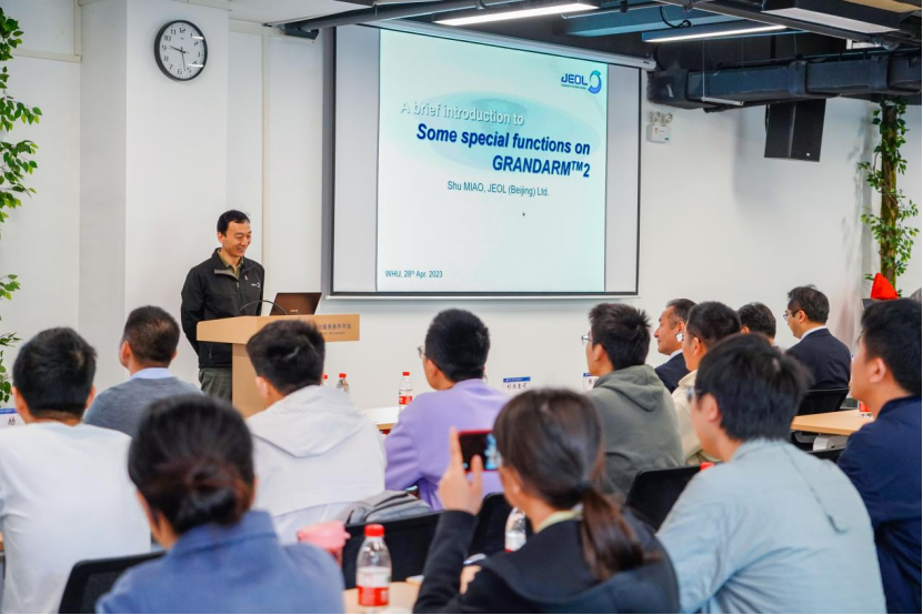 仪式结束后,苗澍老师做了题为《JEM-ARM300F2功能简介》的主题报告,为大家介绍了与300 kV双球差校正透射电子显微镜GRANDARMTM2相关的具有国际前沿技术水平的功能。其中包括在TEM中实现超高分辨的二次电子像、分段环形全场探测器(SAAF)、4D STEM 以及Electrostatic Dose Modulator(EDM)等先进技术的进步,并就相关案例与在场的专家同行进行了深入交流。