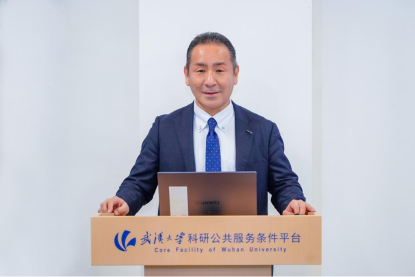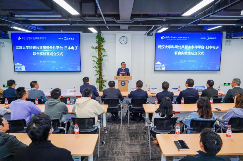 点点app校长助理陈慧东,实验室与设备管理处处长毕卫民,点点手机版下载安装官网主任、湖北省电子显微镜学理事长王建波教授,点点手机版下载安装官网教授级高级实验师周晓东,物理科学与技术学院郑赫教授,物理科学与技术学院高级实验师贾双凤,日本电子公司总经理杉本圭司,销售总监张晓露,售后经理永幡亘平,电镜技术首席专家苗澍,透射电镜产品经理袁建忠,半导体事业部高级销售经理严雪,华中区域销售经理李敏敏以及校内外专家同行参加了揭牌仪式。仪式由王建波教授主持。