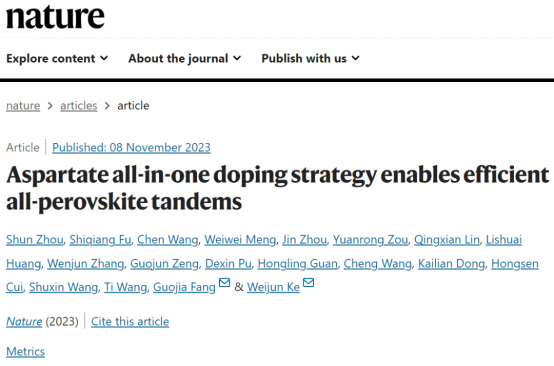 点点app方国家&柯维俊等研究者多年专注于钙钛矿太阳能电池领域,并于近期在全钙钛矿串联混合锡铅(Sn-Pb)窄带隙子电池性能和稳定性欠佳问题中取得重大研究进展。相关论文以“Aspartate all-in-one doping strategy enables efficient all-perovskite tandems”为题于2023年11月08日发表在顶级期刊Nature上。