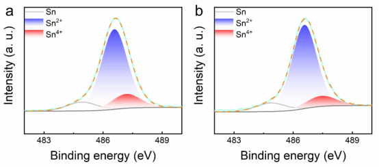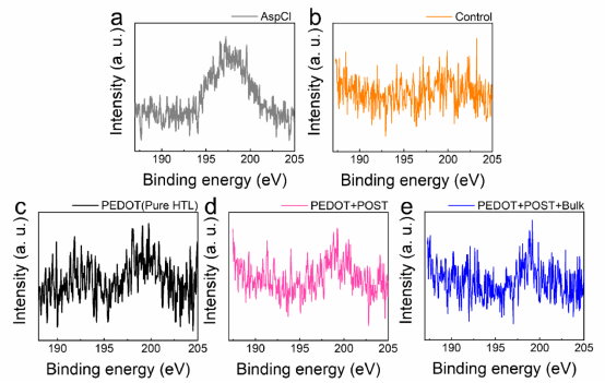 3. 利用X射线光电子能谱仪ESCALAB 250Xi探讨了钙钛矿的化学环境变化和潜在的键合。Sn2+和Sn4+结合能的变化表明了AspCl与钙钛矿之间的相互作用。Cl的XPS光谱验证了钙钛矿薄膜中AspCl的存在。