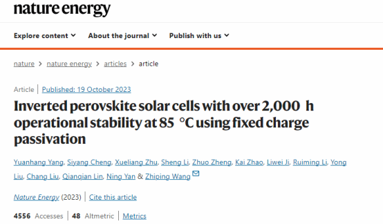 10月20日,《自然·能源》(Nature Energy,IF=56.7)在线发表了点点app王植平教授课题组在钙钛矿太阳能电池领域的最新研究成果。论文题目为“Inverted perovskite solar cells with over 2,000 h operational stability at 85 °C using fixed charge passivation”。