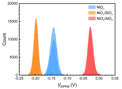 1. 本研究利用原子力显微镜SPM-9700HT KPFM表明了NiOx、SiOx和AlOx薄膜的KPFM电压(VKPFM)(图1c-e),图2、3(补充图18、22)表征了原子力显微镜形态,图4(补充图23)展示了VKPFM的分布,说明AlOx样品的平均VKPFM高于NiOx。并且SiOx样品的平均VKPFM较低,为- 0.198 V。KPFM结果进一步强化了界面处固定电荷的存在。