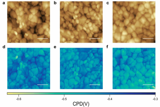 Fig. 2| AFM images (a-c) and contact potential differences (d-f) of perovskite films. (Supplementary Figure 18)