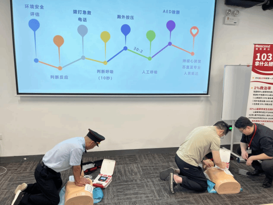 紧接着,讲师进行了心肺复苏(CPR)操作教学,详细演示了胸外按压和人工呼吸的步骤和要点。在自动体外除颤器(AED)使用教学环节中,讲师介绍了AED的基本构造、操作流程和注意事项。通过现场演示,大家了解了AED在心脏骤停患者急救中的关键作用,并掌握了使用方法。