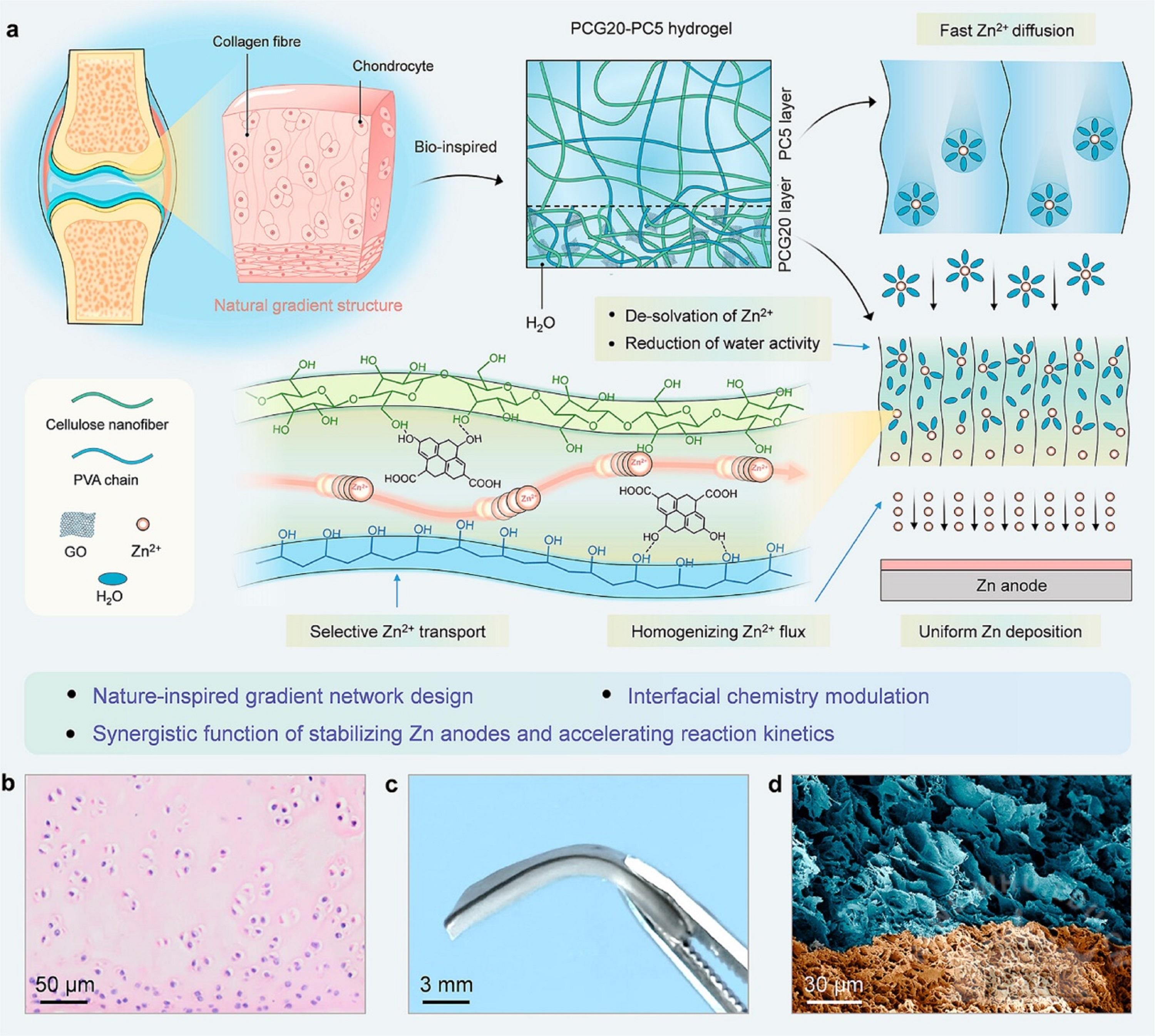 水系锌离子电池因其高安全性、低成本和环境友好性等显著优势,而被认为是下一代大规模储能装置的有力候选。然而,锌负极易产生枝晶及副反应,影响其稳定性,阻碍锌电池的广泛应用。水凝胶电解质虽然被认为是高性能水系锌离子电池的一种极具前景的选择,但是在保持机械强度的前提下,开发兼具快速反应动力学与Zn2+的沉积稳定性的水凝胶电解质,仍是当前极具挑战的难题。鉴于此,研究团队受到关节软骨启发,开发了一种由聚乙烯醇(PVA)、纤维素纳米纤维(CNF)和氧化石墨烯(GO)组成的梯度网络水凝胶电解质,用于水系锌离子电池。该水凝胶电解质具有独特的梯度结构:在正极侧为低网络密度的PVA/CNF