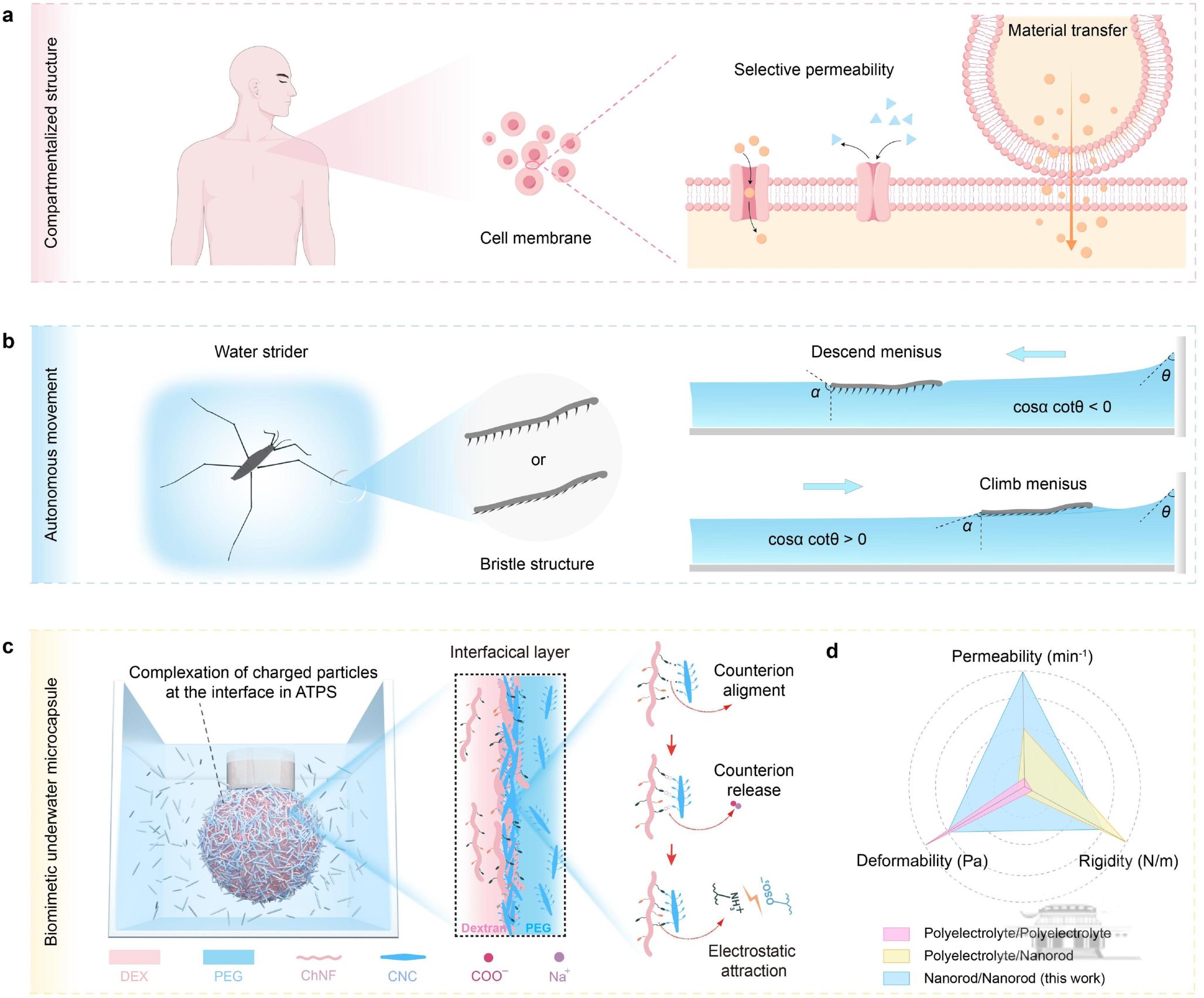 ATPSs)中实现了ChNF/CNC纳米粒子的界面组装,构建出同时具备结构稳定性、刚性、可形变性与渗透性的界面络合物。通过渗透压驱动实现膜层厚度调控,并借助密度差调节微囊在水下的自适应运动。该工作拓展了ATPS在类细胞物质传输、微反应器及液态微型机器人等领域的应用潜力。