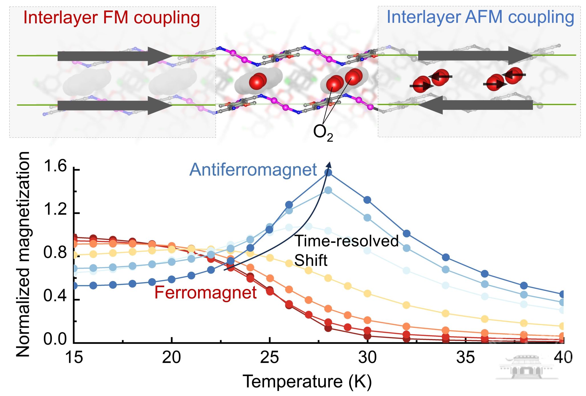 K。密度泛函理论计算进一步证实,O₂二聚体可作为高效“自旋桥梁”,直接介导层间反铁磁耦合,从而实现磁性的连续可控演变。首次揭示了气体分子通过自旋直接驱动磁相演变的动力学过程,也为构筑可编程磁性开关器件、开发高灵敏气体传感器和探索低功耗自旋电子学元件奠定了理论与实验基础。