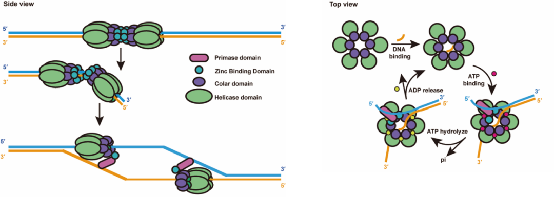 该研究团队首先通过生化实验证明了E5蛋白可以耦合病毒DNA复制的解旋酶和引物酶功能。为了更进一步阐明猴痘E5蛋白的工作机制,研究解析了猴痘病毒E5蛋白七种不同的构型,揭示了双链DNA在猴痘E5蛋白的作用下和ATP的驱动下解旋成单链DNA的过程。研究也提出了双-六聚体可能是解旋起始状态,提出双-六聚体猴痘E5蛋白转变为六聚体的可能过程(图1C)。最终本研究基于一系列成果提出了猴痘病毒引物解旋酶E5的可能工作机制(图2),为后续针对性的抗猴痘病毒药物研发提供了一些思路。